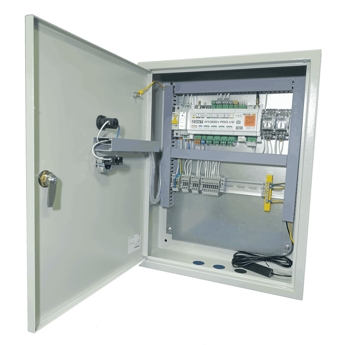 Готовый шкаф автоматики Zont для котельной в металлическом корпусе  Внутреннее устройство шкафа управления котельной Zont: программируемый контроллер, электромагнитные пускатели, клеммные ряды и защитная автоматика Шкаф управления котельной на базе Zont с установленным блоком бесперебойного питания и многоступенчатой системой защиты автоматики  Установленный на стену шкаф автоматики Zont с открытой крышкой